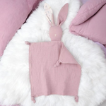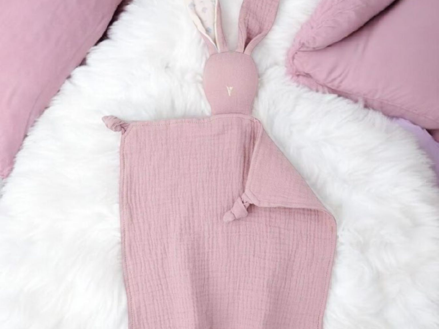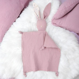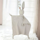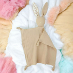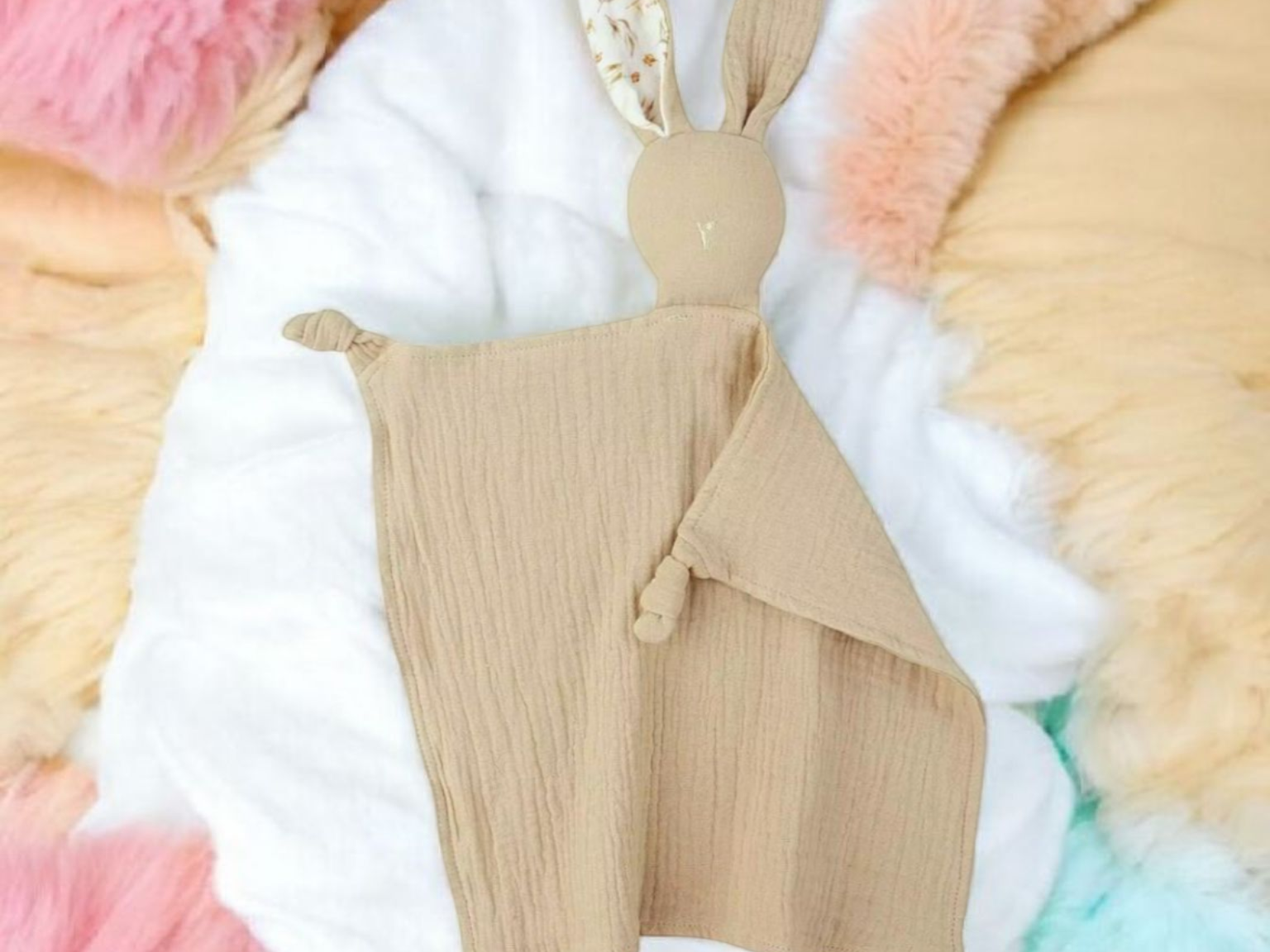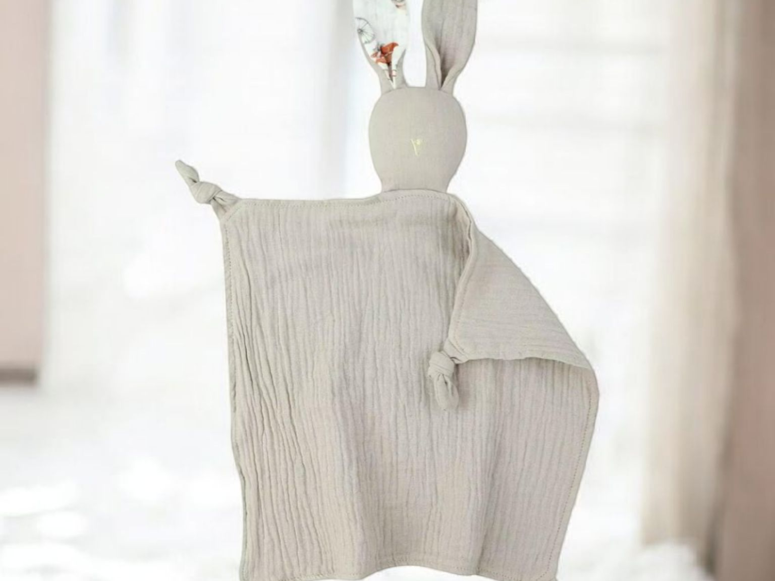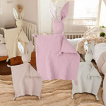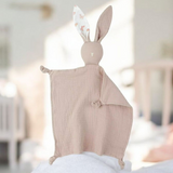 Lovingly crafted from soft, breathable fabric in a calming earthy tone, this adorable bunny comforter is designed to soothe, snuggle, and stay by your child’s side through every adventure. Featuring delicate floppy ears (with a sweet printed inner lining) and charming knotted corners for tiny hands to hold, this comforter is both comforting and sensory-friendly.