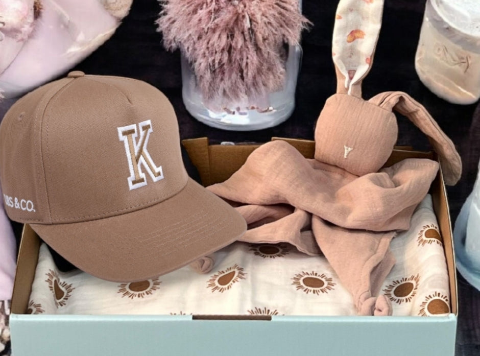 Celebrate new beginnings with the elegance of a thoughtfully curated Cubs & Co. Baby Hamper. Featuring a Choice of Personalised Initial Hat, a Cozy Muslin with a modern sun burst design and a personalised name on a irresistibly cuddly bunny comforter.